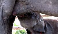 Elephants communicate in various ways. Individuals greet one another by touching each other on the mouth, temporal glands, and genitals. This allows them to pick up chemical cues. Older elephants use trunk-slaps, kicks, and shoves to control younger ones. Touching is especially important for mother–calf communication. When moving, elephant mothers will touch their calves with their trunks or feet when side-by-side or with their tails if the calf is behind them. A calf will press against its mother's front legs to signal it wants to rest and will touch her breast or leg when it wants to suckle.[127]
