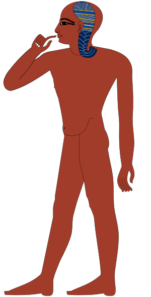 In accordance with the mythological precedent, the children of the king, as his designated heirs, received the Horus lock as an indication of the special duties that were bound up with that status. In iconography, royal children were depicted naked and sucking on their finger, with their heads shaved entirely bald except for the sidelock.