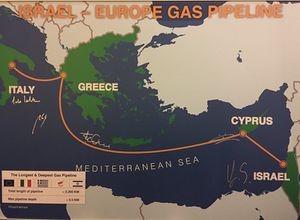 خريطة تـُظهـِر عبور أنبوب الغاز الإسرائيلي-الأوروپي من اليونان إلى إيطاليا، ومكتوب على تلك الوصلة "التيار الجنوبي South Stream"، وهو اسم المشروع الروسي لتوصيل الغاز الروسي إلى أوروپا من الجنوب.[3]