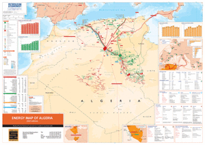 خريطة الطاقة في الجزائر، 2007. توضح الخريطة مسار خط أنابيب الغاز عبر الصحراء باللون الأحمر.