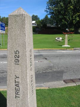 علامة حدود تقليدية، واحدة من عدة علامات على امتداد خط العرض 49. هذه العلامة تفصل بلين، واشنطن عن سري، كولومبيا البريطانية.