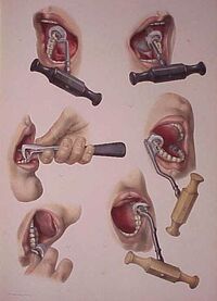Historically, dental extractions have been used to treat a variety of illnesses. Before the discovery of antibiotics, chronic tooth infections were often linked to a variety of health problems, and therefore removal of a diseased tooth was a common treatment for various medical conditions. Instruments used for dental extractions date back several centuries. In the 14th century, Guy de Chauliac invented the dental pelican,[40] which was used through the late 18th century. The pelican was replaced by the dental key[41] which, in turn, was replaced by modern forceps in the 19th century.[42] As dental extractions can vary tremendously in difficulty, depending on the patient and the tooth, a wide variety of instruments exist to address specific situations. Rarely, tooth extraction was used as a method of torture, e.g., to obtain forced confessions.[43]