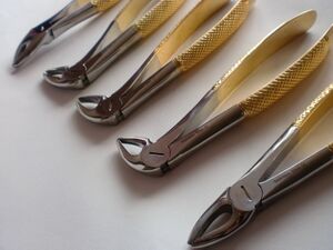 Extraction forceps are commonly used to remove teeth. Different shaped forceps are available depending on the type of tooth requiring removal, what side of the mouth (left or right) it is on and if it is an upper or lower tooth. The beaks of the forceps must grip onto the root of the tooth securely before pressure is applied along the long axis of the tooth towards the root.[1]