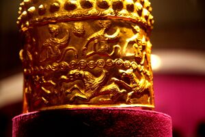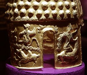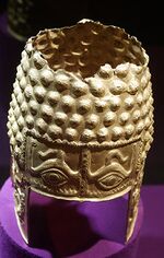 Weighing almost a kilogram, the gold helmet is very well preserved, missing only part of its skull cap. The form of the helmet and its decorations reveal the autochthonous character of this Geto-Dacian artwork. The helmet is decorated with large studs on the top of the skull and two very large apotropaic eyes, meant to ward off the evil eye and magic spells.[1] It was established that it belonged to an unknown local Geto-Dacian king or to a local aristocratic noble, from around year 400 BC.[1]