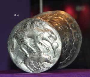 The pair of Voracious Beasts on the Coțofenești neck-guard occupy a lower register along with a similar creature deprived of a victim’s leg.[4] This motif of the "Voracious Beast" is found earlier in Assyrian art, and was popular among the Etruscans. Phoenicia was probably the intermediary for its transferral to Italy and around the Adriatic, but Voracious Beast must also have traveled through Asia Minor to appear in a North Thracian idiom not only on the Coțofenești neck-guard but also in high relief on the base of the Aghighiol beakers (Aghighiol is a village near the Danube Delta in eastern Romania).[4]