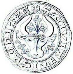 Imprint of the city seal used by the Teuton Order in 1309 with the city coat of arms (bull's head between flower branches) and the inscription S' CIVITATIS KONITZE (abbreviation S' stands for sigillum = seal).