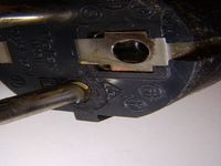 Arc damage to a CEE 7/7 plug. The discharge path was formed by a conductive liquid seeped into the plug-socket assembly. Note the erosion of both the plastic and metal parts. 25 amp circuit breaker was instantly tripped.