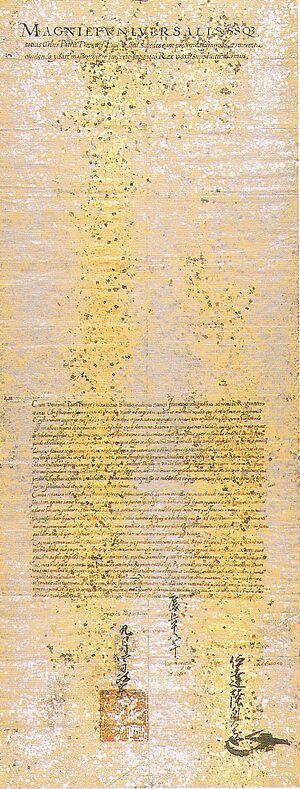When the Tokugawa government banned Christianity, Masamune had to obey the law. However, some sources suggest that Masamune's eldest daughter, Irohahime, was a Christian.[11]
