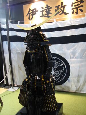 Masamune is known for a few things that made him stand out from other daimyō of the time. In particular, his famous crescent-moon-bearing helmet won him a fearsome reputation. As a child, smallpox robbed him of sight in his right eye, though it is unclear exactly how he lost the organ entirely.[3] Various theories behind the eye's condition exist. Some sources say he plucked out the eye himself when a senior member of the clan pointed out that an enemy could grab it in a fight. Others say that he had his trusted retainer Katakura Kojūrō gouge out the eye for him, making him the "One-Eyed Dragon" of Ōshu.[4]