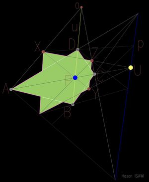 مثلا معلوم رباعي A, B و C, D، وحيث تم تحديد بطريقة تحكمية نقطة X. مطلوب إنشاء نجمة ثمانية بحيث يكون بين رؤوسها علافة التفافية.