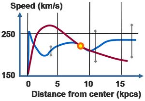 كثافة المادة الداكنة عند موقع الشمس | 0.0088+0.0024 −0.0018 M☉pc-3 أو 0.35+0.08−0.07 GeV cm-3[13] |