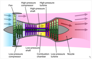 التوربين المروحي | كمبريسور المرحلة الأولى ضخم بشكل قوي حتى يعطي تيار جانبي high bypass حول قلب المحرك للتبريد ولإعطاء كمية قوية من الدفع, معظم أشكال محركات النفاثة تستخدم هذا النظام مثل بوينج 747 وأيضا المحركات العسكرية التي تستخدم نظام الاحتراق للطيران الفوق صوتي. | أقل ازعاجا مع الكمية القوية من التيار المار به وأقل سرعة إجمالية للغازات العادمة, كفاءة أفضل للسرعة ماتحت الصوت عند المسافات الطويلة, أبرد لدرجة حرارة العادم | بها تعقيدات كثيرة (كثرة قنوات الهواء وعادة متعددة الفتحات واالمخارج), محرك ذو قطر كبير نوعا ما, ويحتاج إلى شفرات ثقيلة, سريع التأثر بالأجسام المرتطمة به وبالثلج, السرعة القصوى له محدودة بسبب إمكانية التعرض لموجات الصدمة التي تضر المحرك. |