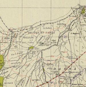 The Survey of Western Palestine identified Daphne with Khirbet Dufnah, meaning "the ruin of Daphne (oleander)", which they marked on their map in the place where Al-Shawka al-Tahta was to stand later, about 1 km NNW of present-day Dafna.[4][5][6]
