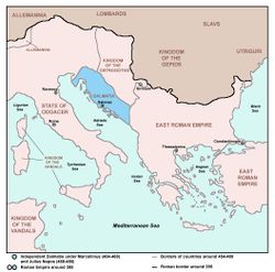 في 454 Marcellinus, a military commander in Dalmatia, rebelled against Valentinian III, the emperor of the west. He seized control of Dalmatia and governed it independently until his death in 468.[16] Julius Nepos became the governor of Dalmatia even though he was a relative of the emperor of the east, ليو الأول التراقي، and Dalmatia was under the western part of the Roman empire. Dalmatia remained an autonomous area. In 474 Leo I elevated Nepos as emperor of the western part of the empire in order to depose Glycerius, a usurper emperor. Nepos deposed the usurper, but was in turn deposed in 475 by Orestes, who made his son Romulus Augustus emperor in the west.[17] Leo I refused to recognise him and still held Julius Nepos as the emperor of the west. Romulus Augustus was deposed in 476 by Odoacer, who proclaimed himself king of Italy. Nepos remained in Dalmatia and continued to govern it until he was assassinated in 480. Ovida, a military commander, was in charge of Dalmatia for a few months. However, Odoacer used Nepos' murder as a pretext to invade Dalmatia, defeated Ovida and annexed Dalmatia to his مملكة إيطاليا. في 488، أرسل زينون، الامبراطور الجديد للشرق، ثيودوريك الأكبر، ملك القوط الشرقيين، إلى إيطاليا للإطاحة بأودواكر. Zeno also wanted to get rid of the Ostrogoths, who were Roman allies and were settled in the eastern part of the empire, but were becoming restless and difficult to manage. Theodoric fought a four-year war in Italy, killed Odoacer, settled his people in Italy وأسس مملكة القوط الشرقيين هناك.[18] دلماتيا وباقي أبرشية پانونيا السابقة وقعوا تحت سيطرة القوط الشرقيين.