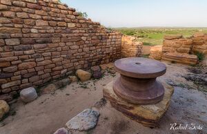 A huge circular structure on the site is believed to be a grave or memorial,[23] although it contained no skeletons or other human remains. The structure consists of ten radial mud-brick walls built in the shape of a spoked wheel.[23] A soft sandstone sculpture of a male with phallus erectus but head and feet below ankle truncated was found in the passageway of the eastern gate.[23] Many funerary structures have been found (although all but one were devoid of skeletons),[23] as well as pottery pieces, terra cotta seals, bangles, rings, beads, and intaglio engravings.[23]