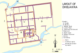 دهولاڤيرا (Dholavira ؛ گجراتي: ધોળાવીરા) is an archaeological site at Khadirbet in Bhachau Taluka of Kutch District, in the state of Gujarat in western India, which has taken its name from a modern-day village 1 كيلومتر (0.62 mi) south of it. This village is 165 km (103 mi) from Radhanpur. Also known locally as Kotada timba, the site contains ruins of a city of the ancient Indus Valley civilization.[1] Earthquakes have repeatedly affected Dholavira, including a particularly severe one around 2600 BCE.[2]