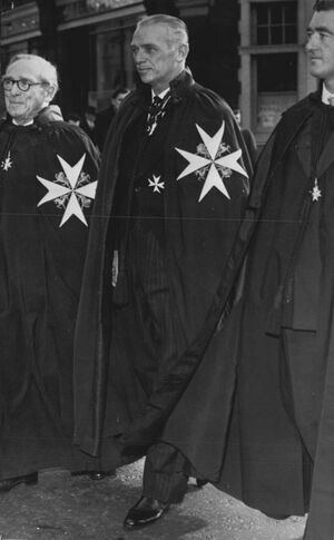 Fairbanks in 1958 wearing the mantle and insignia of a Knight of Justice of the Order of St. John.