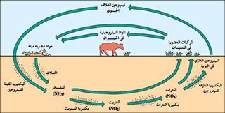 بعد موت النباتات والحيوانات، تتعرض للتحلل بوساطة بكتيريا وفطريات معينة. وتنتج هذه الأحياء الدقيقة النشادر NH3 من مركبات النيتروجين في المادة العضوية الميتة وفي مخلفات الأجسام التي تفرزها الحيوانات. ثم تمتص النباتات بعض النشادر وتستخدمه لصنع البروتينات والمواد الأخرى الضرورية للحياة. ويتحول النشادر الذي لاتمتصه النباتات إلى نترات (مركبات NO3) بوساطة بكتيريا النترتة، وهناك نوعان من بكتيريا النترتة، بكتيريا النيتريت التي تحول النشادر إلى نتريتات (مركباتNO2 ) وبكتيريا النترات، التي تحول النتريتات إلى نترات. تمتص النباتات معظم النترات وتستخدمها بنفس الطريقة مثل النشادر. أما الحيوانات فإنها تحصل على النيتروجين من أكل النباتات أو الحيوانات الأخرى التي تأكل النباتات.
