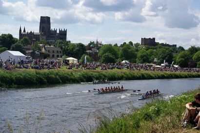 Durham Cathedral and Durham Castle as seen from the river bank whilst a boat race takes place between University College, Durham and Newcastle University