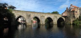 Durham's geographical position has always given it an important place in the defence of England against the Scots.[17] The city played an important part in the defence of the north, and Durham Castle is the only Norman castle keep never to have suffered a breach.[18] In 1314, the Bishopric of Durham paid the Scots a 'large sum of money' not to burn Durham.[19] The Battle of Neville's Cross, took place near the city on 17 October 1346 between the English and Scots and was a disastrous loss for the Scots.[20]