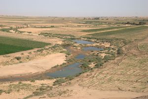 ![]() أطلال "البيت الأحمر" في تل الشيخ حمد الذي كشفت عنه الحفريات (القرن السادس م) | |