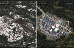 الجيب الصيني في ضلع شي يومي بولاية أروناچل پرادش، صورتان ساتليتان، على اليسار: بتاريخ 19 مارس 2021، على اليمين: بتاريخ 20 سبتمبر 2021.