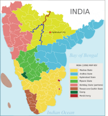 In 1956 during the reorganisation of the Indian States based along linguistic lines, the state of Hyderabad was split up among Andhra Pradesh and Bombay state (later Maharashtra) and Karnataka.[51]