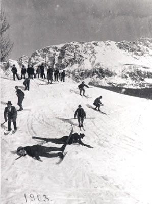 The Dolomites are renowned for skiing in the winter months and mountain climbing, hiking, cycling, and BASE jumping, as well as paragliding and hang gliding in summer and late spring/early autumn.[3][4] Free climbing has been a tradition in the Dolomites since 1887, when 17-year-old Georg Winkler soloed the first ascent of the pinnacle Die Vajolettürme.[5] The main centres include: Rocca Pietore alongside the Marmolada Glacier, which lies on the border of Trentino and Veneto, the small towns of Alleghe, Falcade, Auronzo, Cortina d'Ampezzo and the villages of Arabba, Urtijëi and San Martino di Castrozza, as well as the whole of the Fassa, Gardena and Badia valleys.[6]