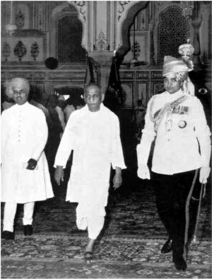 Sardar Patel (centre) leaving the Durbar Hall in Jaipur after the inauguration of the Rajasthan Union in 1949. On the right is Man Singh II, the Maharaja of Jaipur and the first Rajpramukh of the Union; on the left is the Maharaja of Kotah