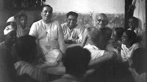 Huseyn Shaheed Suhrawardy, left, prime minister of Bengal (1946–1947) and later prime minister of Pakistan, and Mahatma Gandhi during their 73-hour fast in Calcutta to stop religious violence in the days after India's Independence Day