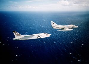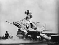 مقاتلة تابعة للبحرية الأمريكية، من طراز A-4E of VA-164 من USS Oriskany (CVA-34) فوق ڤيتنام الشمالية في نوفمبر 1967 | |