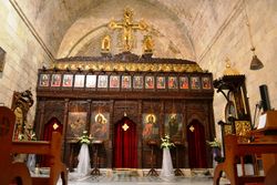 ترتصف على الإيقونسطاس والجدران في كلا الكنيستين مجموعة من الإيقونات رسمت بمعظمها في حلب، بين آخر القرن الثامن عشر وبدء القرن التاسع عشر، وفي القدس، في مرحلة متأخرة من القرن التاسع عشر. وتقدّم هذه الإيقونات عرضًا رائعًا لتاريخ رسم الإيقونات. المثال الرائع على هذا التاريخ الغنيّ، هو إيقونة العذراء "المرشدة إلى الطريق" العجائبيّة، والتي رسمت في السنة 1318، ولكنّ عددًا كبيرًا من الخبراء يعتقد أنّها تعود إلى القرن العاشر، وربّما كانت أقدم إيقونة في الشرق الأوسط. هذه الإيقونة محفوظة اليوم إلى يسار الإيقونسطاس في كنيسة السيّدة، بعد ترميمها على يد ميخائيل الكريتيّ في بدء القرن التاسع عشر.