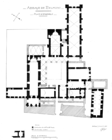 تعود معظم أجزاء الطابق الأرضيّ إلى حقبة الدير السيسترسيّ، باستثناء بعض التعديلات التي أدخلت لتدعيم حماية الدير، وهذا من مميّزات المؤسّسات السيسترسيّة أنّى وجدت. أبنية الدير المنتشرة على مساحة مربّعة الشكل تحوط بساحة مغلقة مكسوّة بالحجر الكلسيّ الأبيض بشكل متناسق وخالٍ من العناصر التزيينيّة. ذلك بأنّ الهندسة السيسترسيّة مطبوعة بالنظام الصارم عينه الذي يطغى على حياة الرهبان. فالدير يجب أن يعكس صورة المربّع الكامل الذي يمثّل أورشليم السماويّة. والمربّع هو الشكل الكامل الذي يرمز إلى الرقم أربعة، عدد الفضائل الجوهريّة، وعناصر الطبيعة وأنهار عدن والأناجيل. كما يذكّر المربّع، بالتعريف الرباعيّ لله الذي قدّمه القدّيس برنار دي كليرفو، مؤسّس الرهبنة السيسترسيّة، بقوله: "إنّه الطول والعرض والارتفاع والعمق".[6]