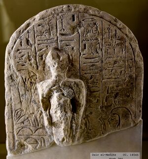 Also in the temple to Hathor, a few of the craftsmen built stelae in honour of her. One such stela is the stele of Nefersenut, in which he and one of his son's kneeling and giving offerings to her in human form.[61]