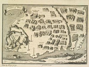 عام 1535 الشاه بهادور، سلطان گجرات، عقد تحالف دفاعي مع الپرتغاليين ضد امبراطور المغل همايون، وسمح [[پرتغاليون|للپرتغاليين] بإنشاء حصن ديو وتشكيل حامية في الجزيرة.
