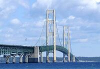 Mackinac Bridge | 3,800 ft (1,158 m) | 26,372 ft (8,038 m) | Suspension | 1957 | St. Ignace and Mackinaw City, Michigan | Designer | 3rd longest main span in United States | |