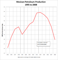 - روسيا: an artificial peak occurred in 1987 shortly before the Collapse of the Soviet Union, but production subsequently recovered, making Russia the second largest oil exporter in the world. Figures from early 2008, statements by officials, and analysis suggest that production may have peaked in 2006/2007.[41][42] Lukoil vice president Leonid Fedun has said $1 trillion would have to be spent on developing new reserves if current production levels were to be maintained.[43]