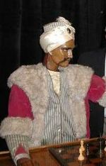 The result of the challenge was the Automaton Chess-player,[4][5] known in modern times as The Turk. The machine consisted of a life-sized model of a human head and torso, with a black beard and grey eyes,[6] and dressed in Turkish robes and a turban—"the traditional costume," according to journalist and author Tom Standage, "of an oriental sorcerer." Its left arm held a long Turkish smoking pipe while at rest, while its right lay on the top of a large cabinet[7] that measured about three-and-a-half feet (110 cm[8]) long, two feet (60 cm) wide, and two-and-a-half feet (75 cm) high. Placed on the top of the cabinet was a chessboard, which measured eighteen inches square. The front of the cabinet consisted of three doors, an opening, and a drawer, which could be opened to reveal a red and white ivory chess set.[9]
