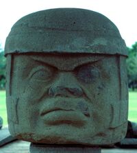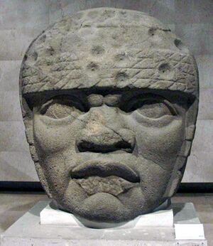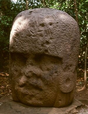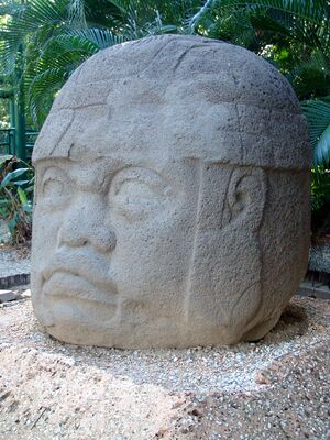 رؤوس الأولمك العملاقة are stone representations of human heads sculpted from large basalt boulders. They range in height from 1.17 إلى 3.4 متر (3.8 إلى 11.2 ft). The heads date from at least 900 BC and are a distinctive feature of the Olmec civilization of ancient Mesoamerica.[1] All portray mature individuals with fleshy cheeks, flat noses, and slightly-crossed eyes; their physical characteristics correspond to a type that is still common among the inhabitants of Tabasco and Veracruz. The backs of the monuments often are flat. The boulders were brought from the Sierra de Los Tuxtlas mountains of Veracruz. Given that the extremely large slabs of stone used in their production were transported over large distances (over 150 كيلومتر (93 mi)), requiring a great deal of human effort and resources, it is thought that the monuments represent portraits of powerful individual Olmec rulers. Each of the known examples has a distinctive headdress. The heads were variously arranged in lines or groups at major Olmec centres, but the method and logistics used to transport the stone to these sites remain unclear. They all display distinctive headgear and one theory is that these were worn as protective helmets, maybe worn for war or to take part in a ceremonial Mesoamerican ballgame.