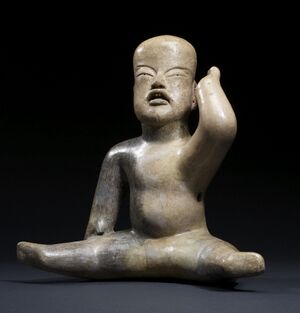 Some of the Olmecs' rulers seem to have served religious functions. The city of San Lorenzo was succeeded as the main centre of the civilization by La Venta in about 900 BC, with Tres Zapotes and Laguna de los Cerros possibly sharing the role; other urban centres were much less significant. The nature and degree of the control exercised by the centres over a widespread rural population remains unclear.[7] Very fine Olmec art, much clearly made for an elite,[8] survives in several forms, notably Olmec figurines, and larger sculptures such as The Wrestler. The figurines have been recovered in large numbers and are mostly in pottery; these were presumably widely available to the population. Together with these, of particular relevance to the colossal heads are the "Olmec-style masks" in stone,[9] so called because none has yet been excavated in circumstances that allow the proper archaeological identification of an Olmec context. These evocative stone face masks present both similarities and differences to the colossal heads. Two thirds of Olmec monumental sculpture represents the human form, and the colossal heads fall within this major theme of Olmec art.[10]