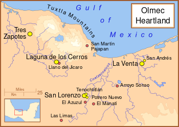 The Olmec civilization developed in the lowlands of southeastern Mexico between 1500 and 400 BC.[3] The Olmec heartland lies on the Gulf Coast of Mexico within the states of Veracruz and Tabasco, an area measuring approximately 275 كيلومتر (171 mi) east to west and extending about 100 كيلومتر (62 mi) inland from the coast.[4] The Olmecs are regarded as the first civilization to develop in Mesoamerica and the Olmec heartland is one of six cradles of civilization worldwide, the others being the Norte Chico culture of South America, the Erlitou culture of China's Yellow River, the Indus Valley civilization of the Indian subcontinent, the civilization of ancient Egypt in Africa, and the Sumerian civilization of ancient Iraq. Of these, only the Olmec civilization developed in a lowland tropical forest setting.[3]