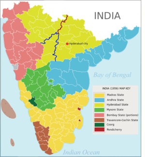 In December 1953, the States Reorganization Commission was appointed to prepare for the creation of states on linguistic lines.[17] The commission, due to public demand, recommended disintegration of Hyderabad state and to merge Marathi speaking region, Maratwada, with Bombay state and Kannada speaking region with Mysore state. The Telugu speaking Telangana region of Hyderabad state with Andhra state.