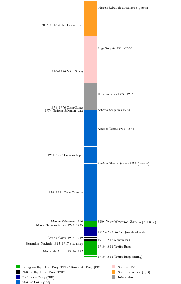 الرئيس الحالي للبرتغال هو مارسلو روبلا دى سوسا ، الذي تولى منصبه في 9 مارس 2016.