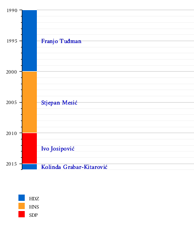 This is a graphical timeline listing of the Presidents of Croatia since 1990. Currently there are two living former presidents: Stjepan Mesić (2000–2010) and Ivo Josipović (2010–2015). There is also one living former acting president: Zlatko Tomčić (2000).