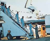 هبوط الطاقم بعد عودتهم من الرحلة الفضائية التي استغرقت سبعة أيام ونصف تقريبًا