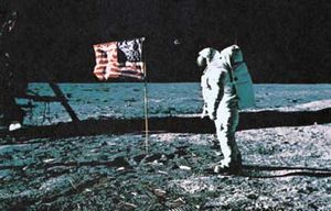 رجل فضاء على سطح القمر. إدوين ألدرين (أعلى) ونيل أرمسترونج هبطا على سطح القمر في 20 يوليو 1969م. العلم الذي تركاه على سطح القمر المعدوم الرياح، تم بسطه بإطار من السلك ليبدو ملوّحًا.