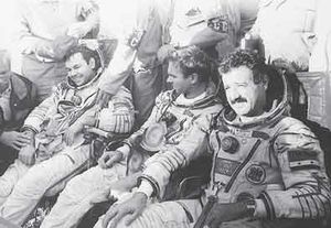 محمد فارس رائد الفضاء السوري مع الفريق الروسي الذي صاحبه في رحلة الفضاء