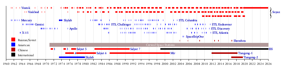 كان يوري هو أول إنسان يرتاد الفضاء، حيث حلق على متن مركبة الفضاء ڤوستوك 1، التي أطلقها الاتحاد السوڤيتي في في 12 أبريل 1961 كجزء من برنامج ڤوستوك. حلق البشر على سطح القمر تسع مرات من عام 1968 حتى 1972 ضمن برنامج أپولو الأمريكي، واستمر 19 عاماً و130 يوماً على محطة الفضاء الدولية.[1] جميع رحلات الفضاء البشرية كانت تحت قيادة بشرية، حيث تم البدء في تصميم أول مركبة فضائية ذاتية تحمل البشر في عام 2015.
