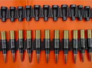 PK machine guns are belt-fed, using non-disintegrating metal belts, which have links that wrap around the cartridge case shoulder all the way around, and are linked by a coiling wire on each side. The links are made of 0.8 mm (0.03 in) thick high carbon stamped steel sheet metal that is zinc phosphated and varnished for protection. These belts are preloaded at ammunition factories in 25-round connectable belt lengths and can be linked to any length necessary. Factory connected PK ammunition belts are available in 25, 100, 200 and 250 rounds lengths. Typical of Soviet machine guns, the PK feeds from the right and ejects its spent cases via an ejection port on the left side of the weapon, contrary to the right side ejection port seen in most Western machine guns.