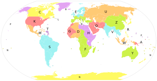Map of world regions classified according to the first letter of the ICAO airport code.